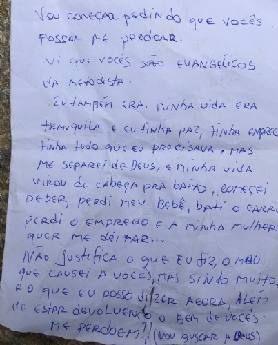 Casal de evangélicos teve carro e aparelhos eletrônicos roubados, e se comove com pedido de perdão de criminoso.