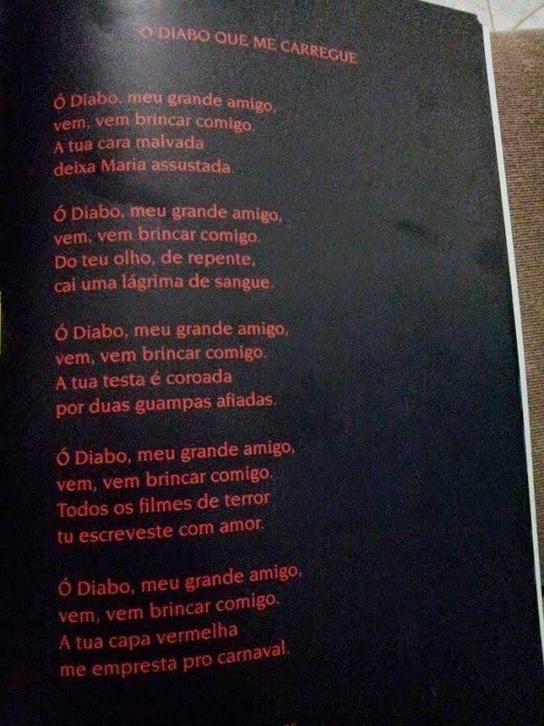 Já no poema “O diabo que me carregue”, numa página de fundo escuro, com letras vermelhas, pode-se ler: “Ó diabo, meu amigo, vem, vem brincar comigo. A tua cara malvada deixa Maria assustada...” E ainda: ...“Todos os filmes de terror tu escrevestes com amor”.