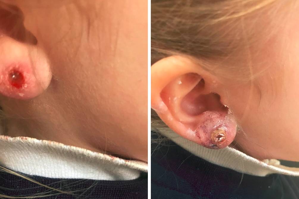 Depois, a orelha de Amelia começou a inchar: “Foi terrível. Eu a levei até o médico e ele me disse para levá-la até o hospital mais próximo“, relembrou Ciara. No hospital, enfermeiras informaram a mãe que a infecção era tão séria que a menina tinha sorte de não ter perdido o lóbulo da orelha: “O que estava saindo era tecido morto. Ele ficou preso no brinco. Era nojento. A enfermeira limpou a ferida e deu antibióticos que ela tomar quatro vezes por dia“, revelou a mãe.