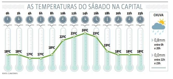 O dia de hoje ainda terá a mesma cara dos últimos, com mínimas de 17ºC e máximas de 27ºC, mas o cenário começa a virar amanhã. O sábado vai bater os mesmos 17ºC pela manhã e não passará dos 24ºC, no meio da tarde. O dia terá chuvas e até alertas para temporais. No domingo, as mínimas vão a 13ºC e, no início da semana que vem, ficam abaixo dos 10ºC de segunda a quarta-feira. A sensação de frio vai aumentar bastante e a máxima nestes dias pode ficar em 18ºC (quase a mínima de hoje).