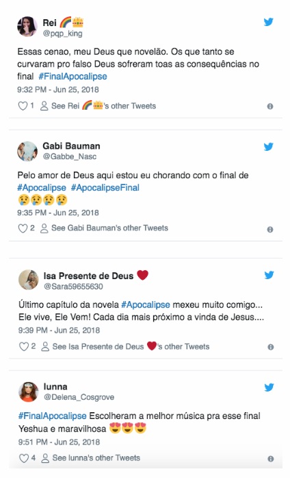 O último capítulo da novela Apocalipse foi exibido na noite desta segunda-feira (25) pela Record e ficou entre os assuntos mais comentados do Twitter.