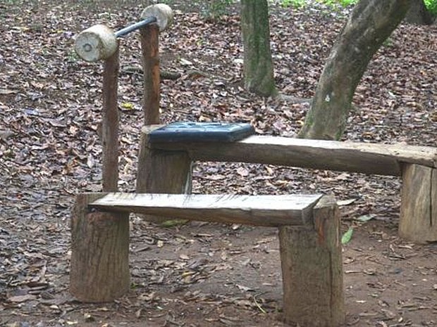 No meio de um bosque, bancos feitos de troncos de árvore e alteres compostos por tubos de ferro e cimento formam uma academia improvisada. A prefeitura também instalou equipamentos no local, mas destinados a idosos.