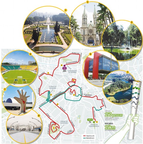 Nesse trajeto de cerca de 13 horas a chama olímpica vai passar por diversos pontos turísticos da cidade. Além do Museu do Ipiranga, ela vai dar o ar da graça na Praça da Sé, Viaduto do Chá, Liberdade, Parque da Luz, Mercadão, Memorial da América Latina, Avenida Paulista, Parque Ibirapuera e Estádio do Pacaembu, entre outros locais.
