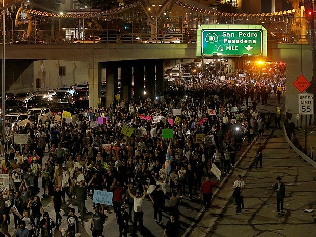 Apesar do apelo feito por Hillary e Obama, milhares de pessoas marcharam espontaneamente pelas ruas das principais cidades dos Estados Unidos para protestar. Entoando cânticos como “Trump não é meu presidente”, manifestantes levavam cartazes com palavras de ordem contra as políticas anunciadas por Trump, durante a campanha eleitoral. A maior parte dos cartazes protestava contra o anúncio de Tramp de que expulsará imigrantes ilegais e barrará a entrada de muçulmanos em território norte-americano. As manifestações começaram em Nova York e Chicago, mas depois se espalharam por dezenas de cidades.