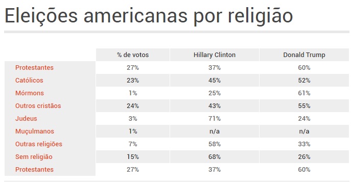 As divulgações do perfil dos eleitores que deram a vitória a Donald Trump mostram que essas duas declarações tiveram influências diferentes. Enquanto 60% dos protestantes ficaram com o bilionário republicano, 71% dos judeus preferiram Hillary. A religiosidade de Trump também incomodou os ateus, já que 68% optaram pela sua adversária.